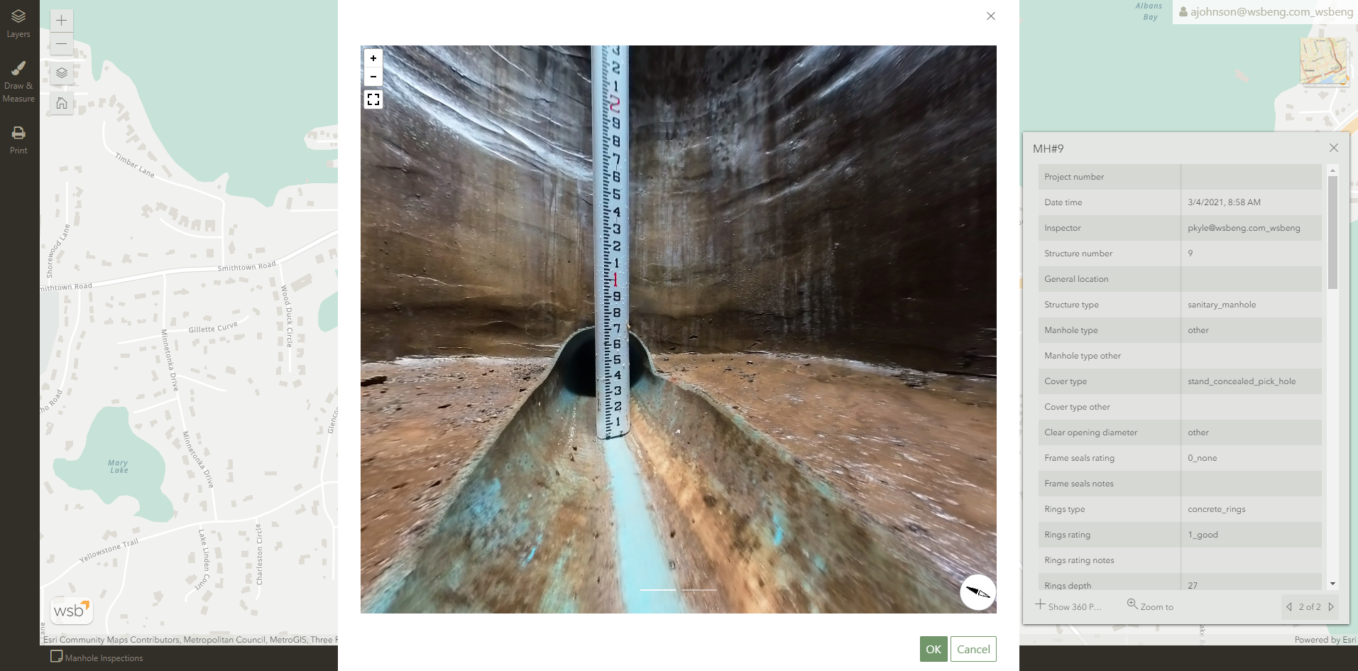 WSB provided the City of Excelsior detailed reports regarding the condition of their sanitary sewer manholes, including a GIS-enabled application that stores the gathered data and the 360º images. This application allows the city staff to quickly view the details and images from both a desktop or mobile device and see actual images of the conditions, reducing both time and risk of sending staff into confined spaces.