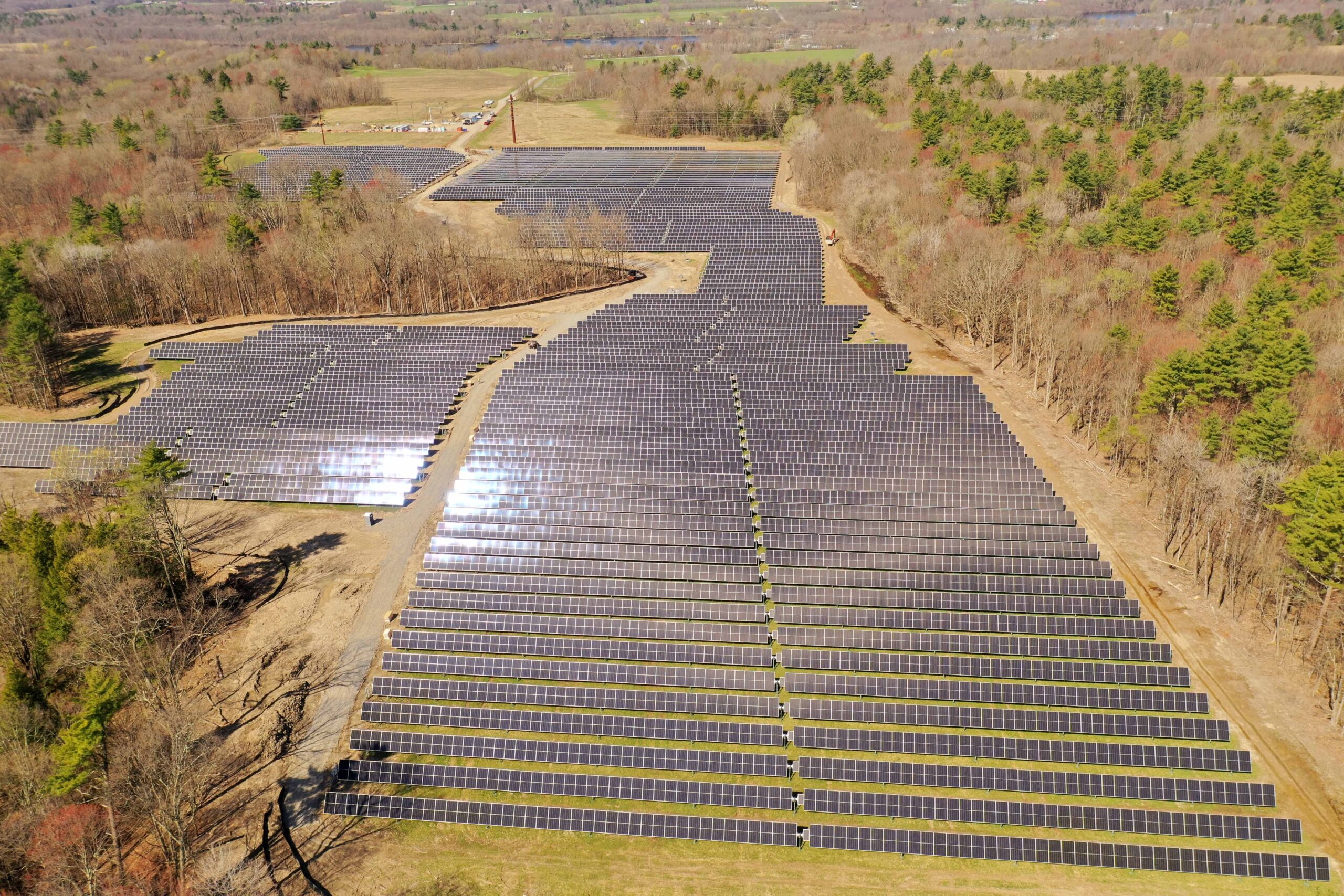 Aerial view of the Fort Edward Community Solar project in Greenwich, New York, showing rows of single‑axis tracking solar panels across the site.